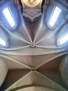 También en la parte del ábside se observan cuatro ventanales con vidrieras diseñadas por el pintor burgalés Marcelino Santamaría y ejecutadas en los talleres de la catedral de León por Juan Bautista Lázaro. En los laterales hay tribunas bajo arcos apuntados con antepechos calados.[3]