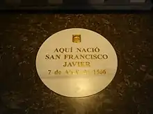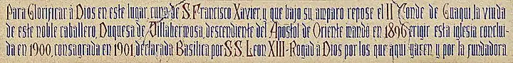 «Para glorificar a Dios en este lugar, cuna de San Francisco Javier; y que bajo su amparo repose el II Conde de Guaqui; la viuda de este noble caballero, Duquesa de Villahermosa, descendiente del Apóstol de Oriente, mandó en 1896 erigir esta iglesia; concluída en 1900, consagrada en 1901, declarada Basílica por S. S. León XIII. Rogad a Dios por los que aquí yacen y por la fundadora»[4]