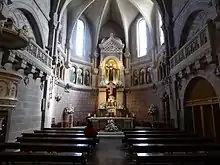 El interior es una nave única neogótica. Se utilizó piedra gris de Gallipienzo, con mármo blanco en el suelo. Está compuesta de tres tramos, rematada con un ábside semicircular y cubierta de unas bóvedas de crucería que en el caso del ábside es pentagonal.