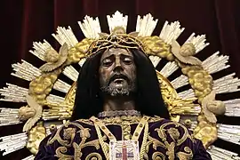 En una de las esquinas de la fachada se sitúa una gran imagen de Jesús Nazareno, que singulariza y remarca el carácter de santuario del lugar.
