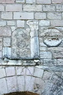 Por encima de una puerta todavía se puede ver, aunque muy dañado, el escudo de Francisco I, es decir, las armas de Francia con tres flores de lis y una salamandra debajo. Cerca de esta puerta, al lado derecho, hay una piedra redonda desgastada por el tiempo donde se pueden ver algunos vestigios de una escultura que representa el cordero, símbolo de san Juan, con una banderola.[19]