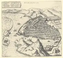 Vista superior de Marsella en 1572. En primer plano la fortaleza de Nuestra Señora de la Guarda.