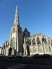 Vista desde la plaza du Martray, la parte de la nave del exterior de la catedral muestra unos masivos contrafuertes y grandes arbotantes.[4] Los contrafuertes centrales del coro tienen pilastras con algunas estatuas en su base que representan a santos bretones y figuras legendarias. Aquí hay algunas imágenes del exterior de la catedral.