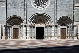 El acceso a la basílica está asegurado por tres portales románicos marcadamente abocinados y adornados por cuatro órdenes de columnas y de arcos emparejados con tonos de diferentes colores (aquí también se usa el mármol rojo de Verona).[4]