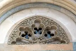 Una restauración reciente ha restaurado el portal que conecta el claustro con la nave izquierda de la basílica. La luneta del portal (originalmente colocada en la entrada de la sala capitular) muestra importantes relieves del siglo XIII con el Agnus Dei rodeado de las figuras del Bautista y de san Juan Evangelista. De particular interés, a la derecha del portal, hay una acquasantiera que sobresale de una ménsula que contiene dos pares de columnas coronadas a su vez por un arco trilobado; en el centro sobre el cuenco, hay un relieve con motivos vegetales y una mano sosteniendo la cruz de Cristo.