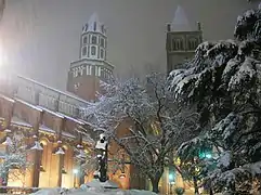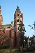 También el campanile que se eleva aislado en el lado derecho de la iglesia —en una disposición ligeramente oblicua con respecto al brazo derecho del transepto— es el más alto de la ciudad con sus 65 metros de altura,[9] y aunque fue construido posteriormente, a principios del siglo XV, presenta unas formas y colores que combinan armoniosamente con los de la basílica.