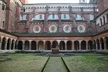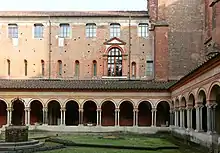 Una reestructuración del claustro tuvo lugar durante el siglo XVI e implicó la cobertura de los pasillos que originalmente debían tener un techo inclinado sostenido por cerchas de madera; en esa ocasión se decidió reutilizar las columnas del antiguo claustro. La estructura del nuevo claustro construido en el siglo XVI es la que se ve hoy en día: se caracteriza por la presencia de arcos de medio punto y de bóvedas de crucería sostenidas por las columnas originales, dispuestas en grupos de cuatro que descansan en una única base. Los capiteles son de crochet, en consonancia con una elección estilística unitaria que también afecta a todas las columnas que decoran el exterior de la basílica. En los intradós de los arcos se encuentran restos de frescos decorativos, geométricos y de grottesca.