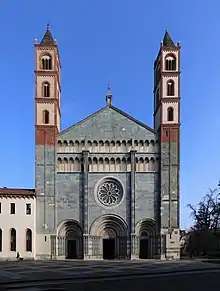 Fue fundada en 1219 por voluntad del cardenal Guala Bicchieri (ca. 1150-1227) y completada en 1227. En ella se mezclan de forma paradigmática la tradición románica (manifestada en la fachada a dos aguas y las logias con arquerías) y las nuevas influencias del gótico europeo. La fachada estrecha entre dos torres (un caso bastante raro en Italia), tiene tres amplios portales abocinados. Dos haces de columnillas rodean el portal central y siguen hacia arriba hasta el más bajo de los dos órdenes de logias que separan la fachada verdadera de un frontón triangular de inspiración clasizante. El gran rosetón se coloca en la intersección de las diagonales que cortan la fachada. El diseño es racionalmente proporcionado, «lúcido como un teorema y lleno de tensión contenida: o como una verdad lógica intuida en el éxtasis» (Giulio Carlo Argan). El proyectista le dio un gran valor a la calidad cromática de los materiales utilizados: está el blanco de los enfoscados, el rojo del ladrillo, el verde de las formas. Externamente, destacan el tiburio octogonal, coronado por una alta linterna, y los arbotantes.