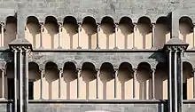 - Detalle de la logieta que corre por los laterales, con la arcada calda y los arcos entrecruzados