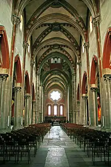 Las tres naves están separadas entre sí por arcos ogivales sostenidos por pilastras fasciculadas con un elemento central cilíndrico rodeado de ocho columnillas, cuya membratura se elevan a lo largo de las paredes hasta que se unen con las nervios de las bóvedas de crucería góticas que marcan los diferentes tramos, rectangulares en la nave central, cuadrados en las laterales. Los espacios internos se destacan por la bicromia de las arquivoltas y de las diferentes membraturas. Se crea así, junto con el rojo de los arcos ogivales, un fuerte contraste cromático con el blanco de las paredes desnudas, produciendo un subrayado de las estructuras arquitectónicas altamente sugerente.