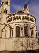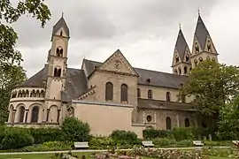 La iglesia es de planta basílical con una nave central y dos laterales. Las estrechas torres del transepto oriental se elevan sobre las naves laterales. El coro, que fue construido alrededor de 1160, con un ábside redondo de tres pisos flanqueado en ambos lados por una torre de cinco plantas. El tercer piso del ábside es una galería enana con 21 arcadas. Algunas de las columnas alrededor de las ventanas llevan un león como símbolo de Cristo.