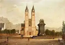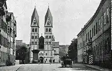 Una cella memoriae (en latín, un pequeño edificio sobre una tumba que era dedicado a la memoria del difunto) fue construyóida frente al coro como una suerte de capilla abovedada funeraria conectada con la iglesia por una cripta circular. En el siglo X, el recinto se extendió hacia el este como un coro en forma de rotonda. Probablemente del mismo tiempo son las dos naves laterales y la parte inferior del extremo occidental del edificio (la entrada). Estaba flanqueado por dos torres redondas, reemplazadas en 1103 por las dos torres que existen en la actualidad. Sin embargo, las torres originalmente tenían solo cinco pisos de altura.