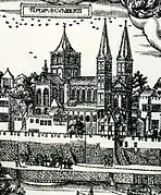 - Detalle con la Basílica , 1531-57, grabado en madera "Grandes vues de Cologne"