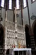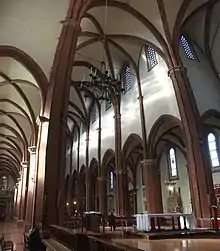 El interior tiene tres naves puntuadas por pilares octogonales con altísimas bóvedas hexapartitas (en comparación con la altura de la basílica) (es decir, divididas en seis paños, como en Notre Dame en París ). En el coro hay un deambulatorio absidal con una corona de nueve capillas radiales.