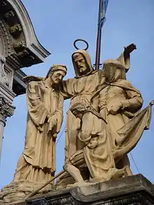 En el centro se encuentra un conjunto escultórico donde San Francisco de Asís es rodeado por Dante Alighieri, Giotto y Cristóbal Colón: los tres pertencián a la orden franciscana.