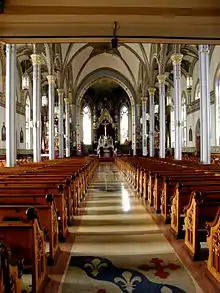 Los dos altares laterales fueron diseñados por J. E. Brielmaier y erigidos en marzo de 1897. Miden 11,0 por 4,6 m (36 por 15 pies) y están hechos de nogal blanco.[3] El altar de María se llama "La coronación" y el de José se llama "La Sagrada Familia". Brielmaier también diseñó el baldaquino de nogal sobre el altar mayor, que es de mármol italiano tallado. Ambos fueron colocados en diciembre de 1897. El baldaquino se eleva a 16 m (52 pies) de altura.[4] El crucifijo tallado en madera sobre el altar fue creado en 1873 para la iglesia original.[4] El púlpito, adornado de 1906, se encuentra a la izquierda del altar. También tallado en nogal blanco, originalmente estaba ubicado en la nave y tenía un dosel tallado sobre él. Fue trasladado al presbiterio en la década de 1940 y el dosel se retiró en ese momento. Las imágenes talladas en el púlpito incluyen a los evangelistas: Mateo, Marcos, Lucas, Juan y los apóstoles Pedro y Pablo; y cinco doctores de la Iglesia occidental: Ambrosio, Jerónimo, Gregorio, Agustín y Tomás de Aquino. Un altar independiente fue creado por Fritz Ganshirt y colocado en 1973.