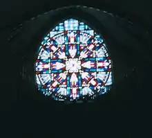 La iglesia alberga 64 grandes ventanas acristaladas,[2] dos ellas notables. El principal es un rosetón sobre las entradas al templo, instalado en 1959. Reemplazó una ventana convencional de la iglesia en la que el marco se había deteriorado. Se seleccionó un motivo indio en reconocimiento de muchas tribus indígenas locales que habitaban esta área 150 años antes.