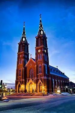 La basílica presenta la arquitectura del renacimiento gótico estilo Ruskin.[3] Las dos agujas son de 65 m (212 pies) de altura con cruces de 4,3 m (14 pies) cubriendo las agujas.[2] Esto ayuda a hacer que la iglesia sea visible desde mucha distancia. La iglesia muestra una estructura rectangular que mide 53,2 por 21,3 m (174,5 por 70 pies) y una altura de 23 m (76 pies).[3] Tiene un ábside poligonal en su lado occidental. El interior incluye columnas y techos abovedados. La iglesia tiene una capacidad de aproximadamente 1.000 personas,[3] habiendo unas 5.000 personas en total en la parroquia.[2]