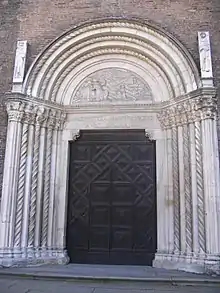 El edificio muestra la influencia de la arquitectura cisterciense borgoñona y tiene algunos elementos de similitud con la basílica de San Francisco en Bolonia.[4] La iglesia está precedida, en el exterior, por una escalinata de mármol de 8 peldaños que permite el acceso al atrio de la iglesia. La fachada principal de barlovento, realizada en ladrillo visto, tiene dos contrafuertes cuadrangulares colocados en los extremos derecho e izquierdo y se divide en dos niveles, separados entre sí por un marco horizontal colocado a dos tercios de la altura total del edificio. La fachada está dividida en tres partes por otros dos contrafuertes que rematan en el centro del nivel superior con una cúspide en forma de pirámide[1].