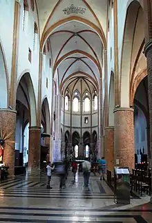 El interior presenta una estructura basilical de tres naves caracterizada por bóvedas de crucería. La nave principal se compone de 5 tramos y está separada de las dos naves laterales menores por una serie de arcos apuntados.