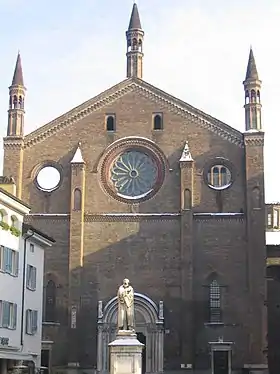 Entre los dos contrafuertes centrales hay un rosetón caracterizado por un marco de terracota con arcos entrelazados. A los lados del rosetón hay dos óculos. El edificio tiene tres portales en la fachada, de los cuales el principal, situado en posición central y realizado en mármol durante el siglo XIV, es de estilo gótico tardío lombardo con abocinamientos de múltiples cordonaduras. El portal está rematado por un luneto, decorado con un bajorrelieve que representa los estigmas de san Francisco, que data de los años alrededor de 1480[4], obra de Guiniforte Solari y su hijo Pierantonio.[6] Los dos portales menores, de época posterior, son de piedra, mientras que sobre ellos se sitúan dos ventanas monóforas caracterizadas por arcos de medio punto.[1]