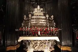 - sobre el altar, ricamente decorado con relieves de bronce en campo de lapislázuli, una gran urna octogonal en plata y cristal contiene el cuerpo de San Gaudencio, obra de Francesco Castelli.