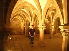 Contiene un presbiterio alargado, tres ábsides y tres claustros y dos torres en la parte oriental. Los materiales de construcción son granito y arenisca.