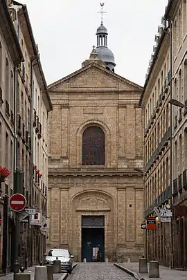 El estilo exterior del edificio recuerda, en menor escala, al de la iglesia del Gesù de Roma o a Notre-Dame-des-Victoires en París.[18] Es de superficie modesta —43 m × 26 m— y tiene forma de cruz latina con una nave de tres tramos y dos laterales, un ábside inclinado y un transepto poco saliente.[57]