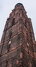 La estructura se remonta al siglo XIV, cuando la construcción fue encargada por la ciudad. La torre principal, rematada por una estilizada aguja de estilo gótico, tenía originalmente 130 metros de altura. La iglesia fue dañada por una fuerte tormenta en 1529, que destruyó la torre. Reconstruida entre 1531 y 1535 en estilo renacentista, ahora tiene 91,5 metros y existe una plataforma de observación en la parte superior, abierta al público. La iglesia también fue afectada por un incendio en 1976, que destruyó el órgano.