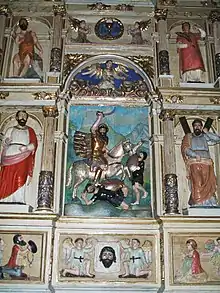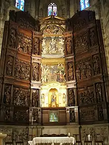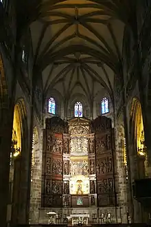 Contiene el retablo mayor, imponente obra renacentista realizada por los hermanos Beaugrant, quienes tallaron la parte derecha a partir de 1533, y Juan de Ayala, autor de las calles central e izquierda desde 1549. El ensamblaje de la mazonería, formada por predela, tres cuerpos y ático segmentados en tres calles y cuatro entrecalles, correspondió a Juan Imberto. La calle central está presidida por una talla gótica del siglo XIV de Santa María. Encima están representadas la Anunciación, la Asunción y la Trinidad. En las calles laterales aparecen representadas diversas escenas de la vida de Cristo. Entre las calles laterales se incluyen esculturas que representan a los evangelistas, los apóstoles y los padres de la Iglesia. Las diferencias de estilo entre los dos imagineros son claras: sobresale la expresividad y elegancia de Beaugrant frente al menor dinamismo de las figuras de Ayala. Fue sufragado con un legado del preboste Lope García de Salazar y Mena, muerto en 1536, cuyo escudo y figura aparecen en el zócalo de piedra en la base. Las obras fueron terminadas por Juan de Beaugrant y Juan de Ayala hacia 1555. La falta de medios económicos impidió el acabado policromado. Fue en 1749 cuando el artista Andrés de Rada pintó la calle central en estilo rococó. Este retablo fue sometido a una restauración entre 1986 y 1988.