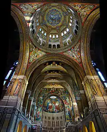 El estilo romano-bizantino de la basílica está inspirado en la Basílica del Sagrado Corazón de París. El edificio tiene forma de cruz latina, con nave, coro y transepto. El crucero está coronado por una imponente cúpula. El interior es todo de una pieza, sin naves laterales. La mayor parte del interior de la basílica está cubierta con mosaicos.