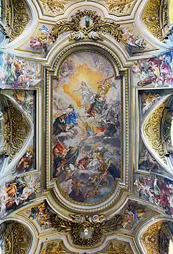 La caída de los ángeles rebeldes, de Giovanni Odazzi, sobre el presbiterio, es impresionante por el efecto visual que produce. Pero las dos obras más notables son el magnífico fresco de la bóveda, el Triunfo de la orden franciscana, de Baciccio (1707) y el monumental sepulcro del papa Clemente XIV, de Antonio Canova (1787). La bóveda de la sacristía fue decorada por el veneciano Sebastiano Ricci.
