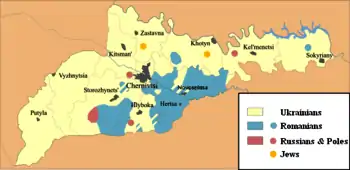 La mayoría de los habitantes son ucranianos y hay comunidades de rusos ( lipovanos ) y rumanos ( moldavos ). Las localidades del norte de Besarabia donde la mayoría de los nativos se declararon " rumanos " o " moldavos " son:
