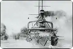 ![]() El HMS Swiftsure (1903) en prácticas de artillería en una de las Bases de las Indias Orientales en el verano del año 1913 | ||