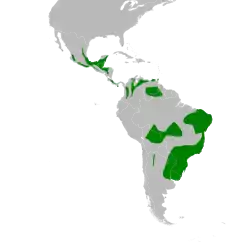 Se la encuentra en Argentina, Belice, Bolivia, Brasil, Colombia, Costa Rica, El Salvador, Guayana francesa, Guatemala, Guyana, Honduras, México, Nicaragua, Panamá, Paraguay, Surinam, Trinidad y Tobago, Estados Unidos, Uruguay y Venezuela.[1]
