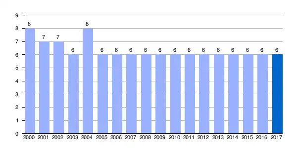 Gráfica de evolución demográfica de Basquiñuelas[1] entre 2000 y 2017 |