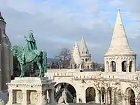 Entre el Bastión y la Iglesia de Matías (Budapest) se alza una escultura ecuestre en bronce del rey Esteban I de Hungría, erigida en 1906. El pedestal fue construido por Alajos Stróbl, basado en el proyecto de Frigyes Schulek en estilo neorrománico y con episodios que ilustran la vida del monarca.