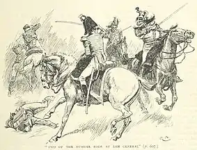«Dirigiéndose a sus valientes hombres, el general Roize dijo: '¡Amigos, nos están enviando a la gloria y la muerte! ¡Marzo!' La acusación fue terrible (…) El valiente general Roize, al ver retroceder su primera línea, avanzó con la segunda, hizo una carga desesperada y penetró hasta el campamento de la segunda línea inglesa, sabroyendo y derribando a todos en su camino. Los aterrorizados ingleses se tiraron de bruces al suelo; otros huyeron a sus tiendas; pero este obstáculo detuvo la terrible carrera de nuestra caballería y causó nuestra ruina. Los ingleses habían cavado pozos de lobos en su campamento, y esparcidos caltrops, abundantemente. Los caballos cayeron en estos pozos, o se enredaron entre los cordones y las clavijas de las tiendas. El valiente y desafortunado general Roize, al descubrir que no había posibilidad de escapar de tal posición, se desmontó, luchó como un león y fue asesinado, al igual que sus hombres».[4]