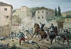 Los liberales llegaron al pueblo hacia las ocho de la tarde, a punto de anochecer. El brigadier Cabrinetty no sospechaba la emboscada que les tendieron y murió en los primeros intercambios de disparos. Las tropas republicanas hicieron frente a sus enemigos sin mando y durante ocho horas, en plena noche. Los durísimos combates dejaron cerca de un centenar de muertos, la mayoría liberales, al son de los valses y las marchas militares interpretadas por un grupo de músicos carlistas. Algunos republicanos pudieron escapar, pero los carlistas hicieron prisioneros a 900 soldados. También consiguieron un abundante botín, en armas, munición y 10 000 duros.[1]