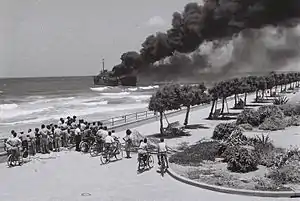 Altalena en llamas después de ser bombardeada, cerca de Tel-Aviv, Begin por su parte se había abordado el Altalena, que se dirigía a Tel Aviv, donde el Irgún tenía más seguidores. Muchos miembros del Irgun, que se unieron al ejército israelí a principios de mes, salieron de sus bases y se concentró en la playa de Tel Aviv. Un enfrentamiento entre ellos y las unidades de las FDI comenzaron. En respuesta, Ben-Gurión ordenó Yigael Yadin (actuando Jefe de Estado Mayor) para concentrar grandes fuerzas en la playa de Tel Aviv y tomar el barco por la fuerza. Artillería pesada fueron trasladados a la zona y las cuatro de la tarde, Ben-Gurion ordenó el bombardeo de la Altalena. Uno de los proyectiles impactaron la nave, que comenzó a arder. Yigal Allon, comandante de las tropas en la orilla, afirmó más tarde sólo cinco o seis proyectiles fueron disparados, como disparos de advertencia, y el barco fue golpeado por accidente.
