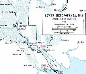 - Esta obra contiene una traducción parcial derivada de «Battle of Basra (1914)» de Wikipedia en inglés, concretamente de esta versión, publicada por sus editores bajo la Licencia de documentación libre de GNU y la Licencia Creative Commons Atribución-CompartirIgual 3.0 Unported.