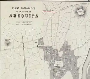 ![]() Detalle del Plano Topográfico de Arequipa elaborado por Mariano Paz Soldán en el año 1865 en el que se muestra el escenario de la batalla de Carmen Alto al norte de la entonces Villa de Cayma. | ||||