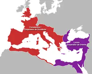![]() Imperio romano en 317, al finalizar la primera guerra entre Constantino y Licinio. | ||||