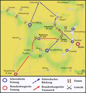 Por otra parte, los campos brandeburgueses habían sido quemados para dificultar a los suecos encontrar forraje. A principios de junio,[7] Wrangel -o Mardefelt- había permitido que se dividieran las fuerzas suecas. El Gran Elector aprovechó la coyuntura para iniciar un movimiento que pudiera darle la posibilidad de derrotar decisivamente a su enemigo.
