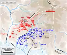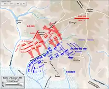 La batalla de Gaines's Mill, a veces conocida como la batalla del Río Chickahominy, tuvo lugar el 27 de junio de 1862, en el condado de Hanover, Virginia, como la tercera de las batallas de los Siete Días (Campaña de la Península) en el Teatro del Este de la Guerra Civil Estadounidense. Después de la inconclusa batalla de Beaver Dam Creek (Mechanicsville) el día anterior, el General Confederado Robert E. Lee renovó sus ataques contra el flanco derecho del Ejército de la Unión, relativamente aislado en el lado norte del río Chickahominy. Allí, el V Cuerpo del General de Brigada Fitz John Porter había establecido una fuerte línea defensiva detrás de Boatswain's Swamp. La fuerza de Lee estaba destinada a lanzar el mayor ataque confederado de la guerra, unos 57.000 hombres en seis divisiones. El reforzado Cuerpo V de Porter se mantuvo firme por la tarde mientras los confederados atacaban de manera desarticulada, primero con la división del Mayor General A.P. Hill, luego con el Mayor General Richard S. Ewell, sufriendo graves bajas. La llegada del mando del Mayor General Stonewall Jackson se retrasó, impidiendo la concentración total de la fuerza confederada antes de que Porter recibiera algunos refuerzos del VI Cuerpo.