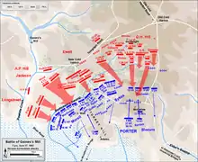 En vez de perseguir a un enemigo que huía, como sus órdenes habían ordenado, A.P. Hill había atacado una posición atrincherada de la Unión, perdiendo cerca de 2.000 de sus 13.200 hombres en el intento fallido. Combinado con sus ataques en Mechanicsville el día anterior, la división ligera había perdido más de un cuarto de sus hombres. El general McClellan se sintió alentado por los telegramas que Porter envió a su cuartel general unos pocos kilómetros atrás. Él le contestó: "Si el enemigo se retira y tú eres un cazador, participa". También le dijo a Franklin que cruzara el río por el puente Duane y atacara el flanco del enemigo si veía una oportunidad, pero le consternó saber que el comandante del VI Cuerpo había destruido el puente por temor a un posible ataque enemigo. Al mismo tiempo, el general de brigada Edwin V. Sumner del II Cuerpo informó de actividad enemiga en su frente. El optimismo de McClellan fue frustrado y ordenó que su equipo del cuartel general fuera empacado en preparación para la retirada. En el lado confederado, el general Lee había participado activamente en el asalto fallido, reuniendo a sus tropas demasiado cerca del frente para su comodidad. Cuando Longstreet llegó al suroeste de A.P. Hill, vio la dificultad de atacar sobre ese terreno y se retrasó hasta que Stonewall Jackson pudo atacar a la izquierda de Hill.[11]
