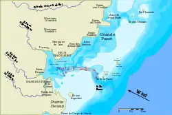 Cuatro de los cinco barcos franceses lograron romper el bloqueo británico, refugiándose en el fondeadero protegido, al que únicamente se podía acceder a través de una serie de complicados arrecifes y bancos de arena que eran intransitables sin un experimentado piloto de puerto. Cuando Pym ordenó a sus fragatas que atacaran a los franceses anclados los días 22 y 23 de agosto, sus barcos quedaron atrapados en los estrechos canales de la bahía: dos estaban irremediablemente conectados a tierra; un tercero, superado en número por el escuadrón francés, fue derrotado; y un cuarto fue incapaz de cerrar dentro de una distancia de arma efectiva. Si bien los barcos franceses también sufrieron graves daños, la batalla fue un desastre para los británicos: un barco fue capturado después de sufrir daños irreparables, los barcos en tierra fueron incendiados para evitar su captura por parte de los grupos de abordaje franceses y el barco restante fue incautado.