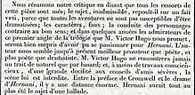 Que M. Hugo ne s'y trompe pas, ses pièces trouvent plus d'opposition à son système politique qu'à son système dramatique ; on leur en veut moins de mépriser Aristote que d'insulter les rois [...] et on lui pardonnera toujours plus aisément d'imiter Shakespeare que Cromwell.[134]Que no se equivoque el señor Hugo, sus obras encuentran más oposición por su sistema político que por su sistema dramático; se le reprocha menos su desprecio a Aristóteles que su insulto a los reyes [...] y siempre se le perdonará mejor imitar a Shakespeare que a Cromwell.