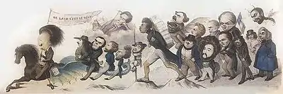 El reclutamiento de la claque romántica se efectuó entre los estudiantes de los talleres de pintura y de escultura, a los que se unieron jóvenes literatos y músicos. Fueron ellos quienes, con sus trajes excéntricos, sus cabelleras hirsutas y sus bromas macabras, causaron sensación entre el público refinado del Théâtre-Français.[87] Del seno de esta nueva generación que componía «el ejército romántico» en las representaciones de Hernani, emergieron los nombres de Théophile Gautier, Gérard de Nerval, Hector Berlioz, Pétrus Borel, etc.[87] Todos ellos eran partidarios de Hugo, ya fuera por haberse adherido a las tesis del prefacio de Cromwell o por tratarse de un autor en el punto de mira de la censura del gobierno. La dimensión generacional se sobreañadía a la dimensión política: unos jóvenes revolucionarios que se oponían a un gobierno gerontocrático, compuesto por antiguos «emigrados» que regresaban del exilio «sin haber aprendido ni olvidado nada», como rezaba un dicho de la época,[88] que quería el fracaso de una obra en la que precisamente un anciano condenaba a muerte a unos jóvenes esposos.[89]