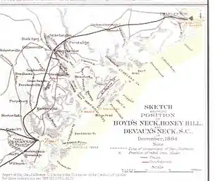 Sin embargo, los mapas y guías de la expedición resultaron inútiles y Hatch no pudo continuar por el camino correcto hasta la mañana del 30 de noviembre. En Honey Hill, a pocas millas de Grahamville, se encontró con una fuerza confederada de regulares y milicias, al mando del coronel Charles J. Colcock, con una batería de siete cañones al otro lado de la carretera. Las tropas de color de los EE. UU. Lanzaron ataques decididos, incluida una brigada dirigida por Alfred S. Hartwell que incluía al 54 ° Massachusetts y al 55 ° Massachusetts.[3] La posición de la fuerza federal era tal que solo se podía usar una sección de artillería a la vez, y los confederados estaban demasiado atrincherados para ser desalojados. La lucha continuó hasta el anochecer cuando Hatch, al darse cuenta de la imposibilidad de atacar con éxito o girar el flanco del enemigo, se retiró a sus transportes en Boyd’s Neck, habiendo perdido 89 hombres muertos, 629 heridos y 28 desaparecidos. Las bajas confederadas ascendieron a ocho muertos y 39 heridos.[4]